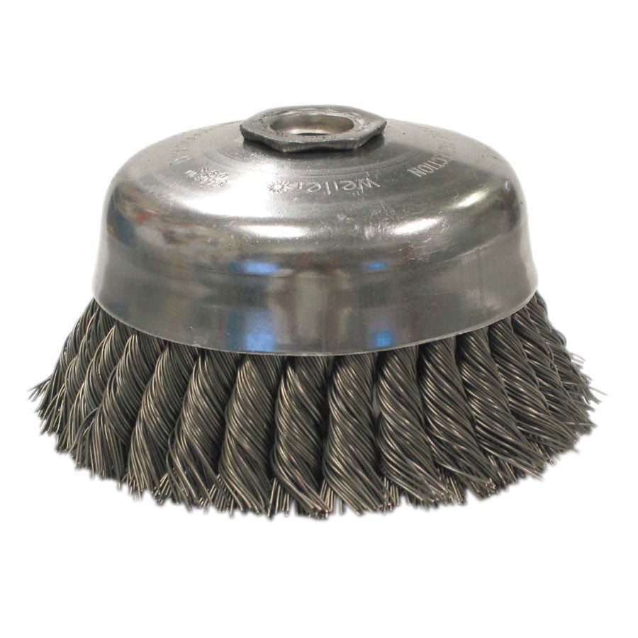 General-purpose stainless steel knot wire brush for fast, effective cleaning of oxides, paint, rust, and scale from large surfaces. For use with right-angle grinders.